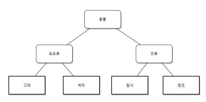 - 위 관계는 상속 관계가 아니다. 동물은 포유류와 조류의 부모가 아니다. 고래 또한 부모가 포유류가 될 수 없다
