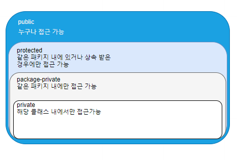 - 아무런 제어자를 적어주지 않을 때이며, package-private라고 불린다. 같은 패키지 내에 있을 때만 접근할 수 있다.