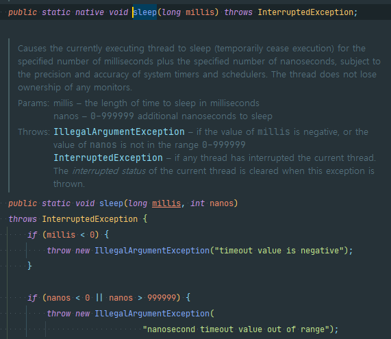 Thread.sleep()메소드를 사용할 때는 항상try-catch로 묶어줘야 한다. 적어도InterruptedException으로 예외 처리를 해줘야한다. 왜냐하면sleep()메소드는InterruptedExcpetion예외를 던질 수도 있다고 선언 되어 있기 때문이다