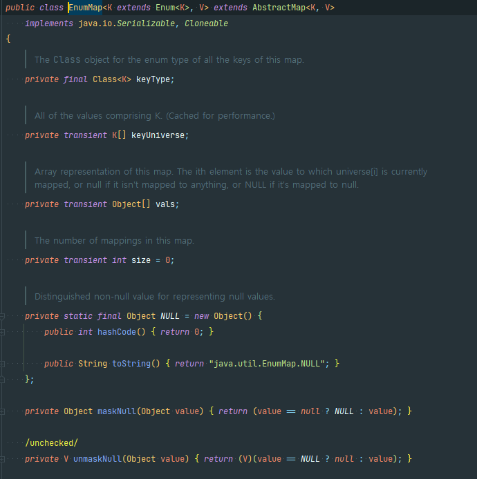 - Enum을 키로 독점적으로 사용하는 Map의 구현이다