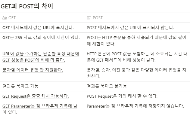 - GET은 일반적으로 길이에 제한이 있지만 브라우저마다 다르다, POST는 HTTP 본문을 통해 제출되기 때문에 값의 길이에 제한이 없습니다.