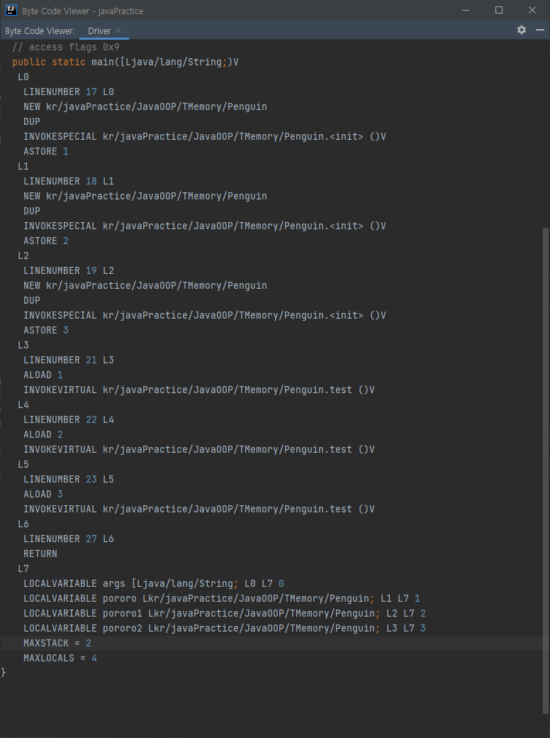 INVOKESPECIAL kr/javaPractice/JavaOOP/TMemory/Penguin.<init> ()V //인스턴스 메소드를 호출하고 결과를 스택에 올린다