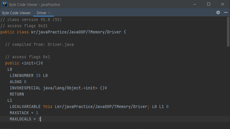 LOCALVARIABLE this Lkr/javaPractice/JavaOOP/TMemory/Driver; L0 L1 0 //지역 변수 저장