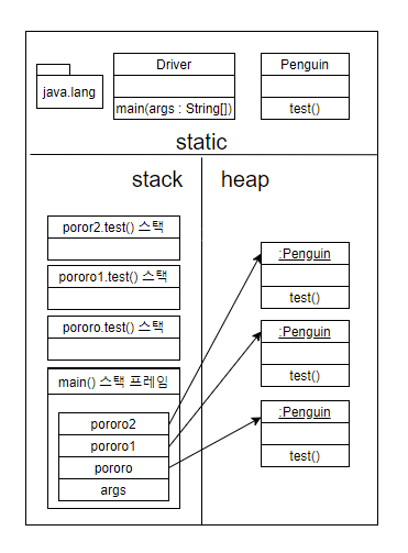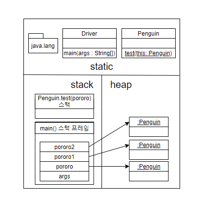 void test(String name)이렇게 컴파일 되어있다 - 바이트코드와 클래스파일 해석하면 heap에 penguin,penguin1,penguin2이 생성되었고 static test메서드에 매개변수인 (Penguin this) 로 사용하게 된다.