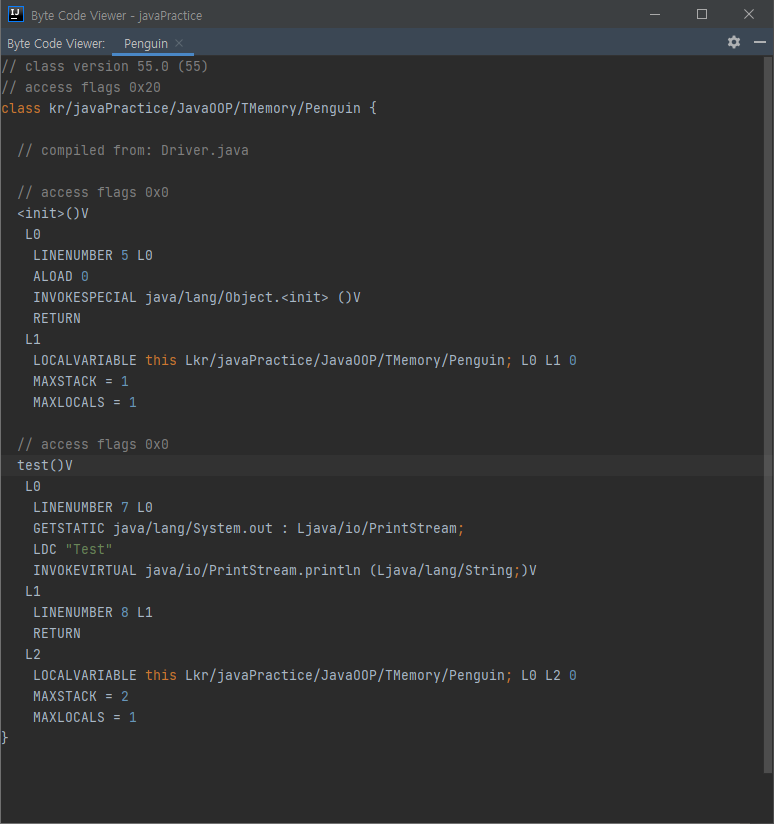 INVOKEVIRTUAL kr/javaPractice/JavaOOP/TMemory/Penguin.test ()V //가상 메소드를 호출하고 결과를 스택에 올린다