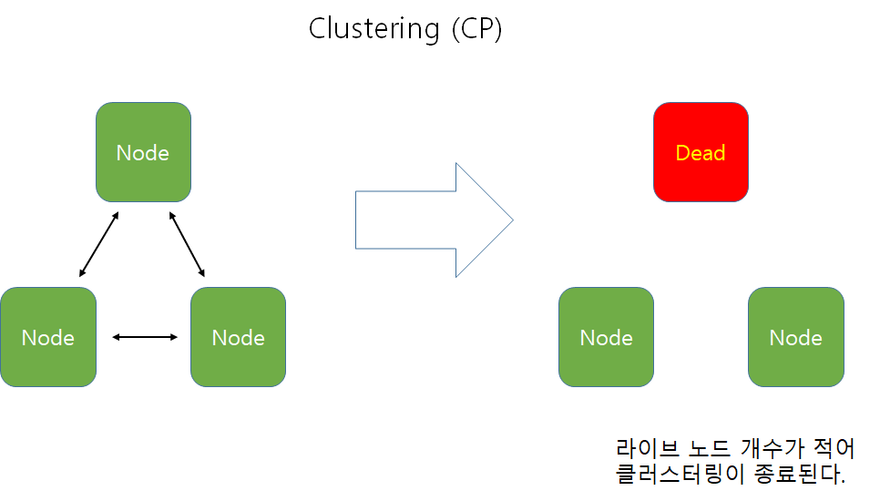 MySQL의 경우 Master - Slave 관계를 사용할 때 CA를, 클러스터 구성을 할 때 CP를 만족한다. Master - Slave 관계를 사용한다면 Slave중 새로운 마스터를 선택할 때 파티션 허용 오차가 생길 수 있다. 클러스터 구성을 한다면 라이브 노드 개수가 적을 때 클러스터가 종료될 수 있다.